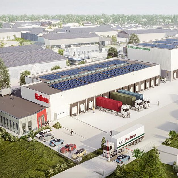 Der Neubau wird konsequent als Zero-Emission-Standort konzipiert. Eine Photovoltaikanlage auf dem Dach, Ladeinfrastruktur für Elektrofahrzeuge sowie weitere nachhaltige Maßnahmen bilden die Grundlage für einen weitgehend emissionsfreien Betrieb. Damit unterstreicht die Raben Group ihren Anspruch, ökologische Verantwortung und wirtschaftliche Leistungsfähigkeit miteinander zu verbinden.