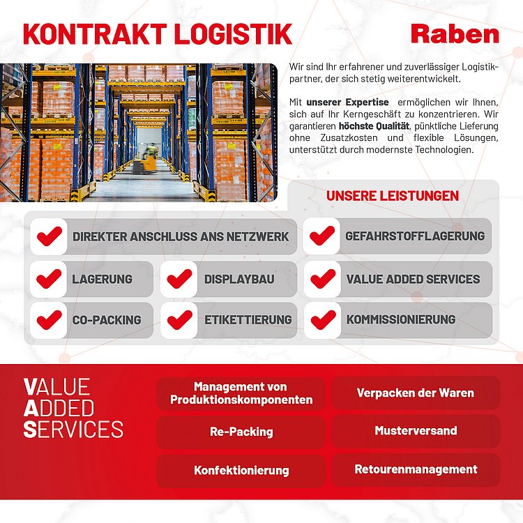 Die Raben Group ist Ihr erfahrener Anbieter für Kontraktlogistik in Deutschland und Europa. Wir übernehmen komplexe logistische Prozesse langfristig und integrieren Transport, Lagerung, Umschlag, Kommissionierung sowie produktionsnahe Dienstleistungen zu durchgängigen Lösungen entlang der gesamten Wertschöpfungskette. Als Kontraktlogistik-Unternehmen verbinden wir standardisierte Prozesse mit einem europaweit einheitlichen Warehouse Management System (WMS) und schaffen transparente, skalierbare und wirtschaftliche Supply-Chain-Strukturen.